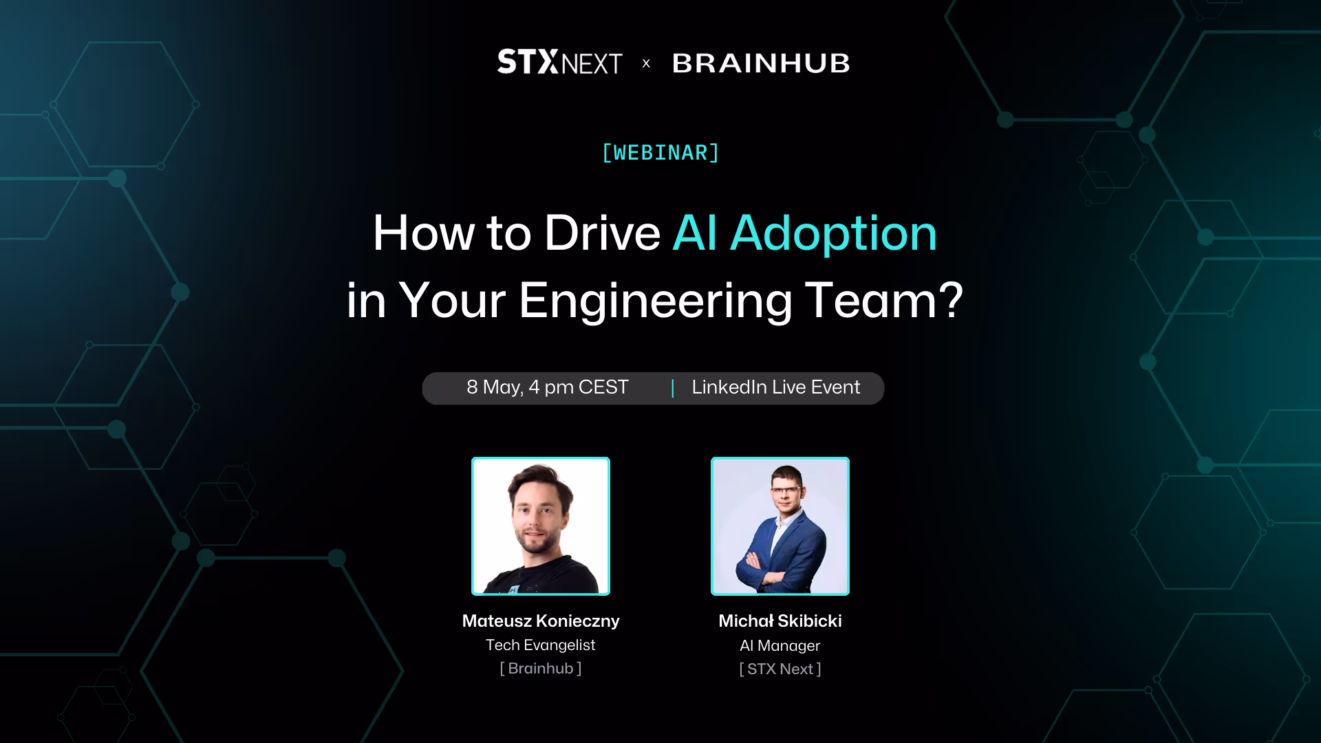 Join Mateusz Konieczny (Tech Evangelist at Brainhub) and Michał Skibicki (AI Manager at STX Next) as they share real-world insights on how tech leaders can successfully introduce AI into their teams and workflows.