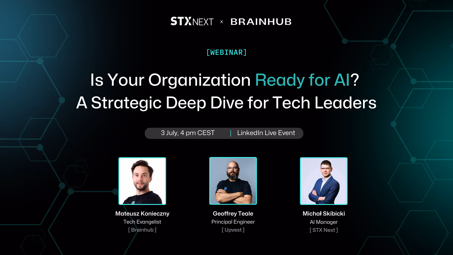 In this session, we’ll tackle a fundamental question: How deeply should AI shape your business? Is your organization truly ready for AI, or even in need of it? Join Mateusz Konieczny (Tech Evangelist at Brainhub), Geoffrey Teale (Principal Engineer at Upvest), and Michał Skibicki (AI Manager at STX NEXT) as they explore the critical questions organizations must ask to move from hype to real impact, and how to guide teams and structures through this transformation.